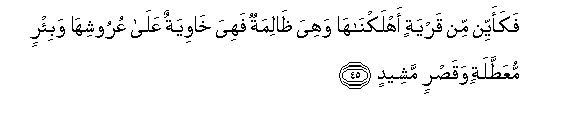 45. Fakaayyin min qaryatin ahlaknaha wahiya thalimatun fahiya khawiyatun AAala AAurooshiha wabi/rin muAAattalatin waqasrin masheedin