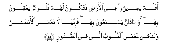 46. Afalam yaseeroo fee al-ardi fatakoona lahum quloobun yaAAqiloona biha aw athanun yasmaAAoona biha fa-innaha la taAAma al-absaru walakin taAAma alquloobu allatee fee alssudoori