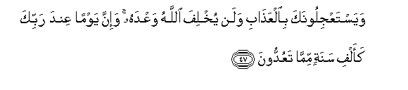 47. WayastaAAjiloonaka bialAAathabi walan yukhlifa Allahu waAAdahu wa-inna yawman AAinda rabbika kaalfi sanatin mimma taAAuddoona