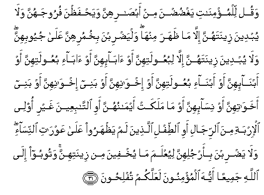 31. Waqul lilmu/minati yaghdudna min absarihinna wayahfathna furoojahunna wala yubdeena zeenatahunna illa ma thahara minha walyadribna bikhumurihinna AAala juyoobihinna wala yubdeena zeenatahunna illa libuAAoolatihinna aw aba-ihinna aw aba-i buAAoolatihinna aw abna-ihinna aw abna-i buAAoolatihinna aw ikhwanihinna aw banee ikhwanihinna aw banee akhawatihinna aw nisa-ihinna aw ma malakat aymanuhunna awi alttabiAAeena ghayri olee al-irbati mina alrrijali awi alttifli allatheena lam yathharoo AAala AAawrati alnnisa-i wala yadribna bi-arjulihinna liyuAAlama ma yukhfeena min zeenatihinna watooboo ila Allahi jameeAAan ayyuha almu/minoona laAAallakum tuflihoona