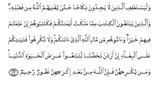 33. WalyastaAAfifi allatheena la yajidoona nikahan hatta yughniyahumu Allahu min fadlihi waallatheena yabtaghoona alkitaba mimma malakat aymanukum fakatiboohum in AAalimtum feehim khayran waatoohum min mali Allahi allathee atakum wala tukrihoo fatayatikum AAala albigha-i in aradna tahassunan litabtaghoo AAarada alhayati alddunya waman yukrihhunna fa-inna Allaha min baAAdi ikrahihinna ghafoorun raheemun