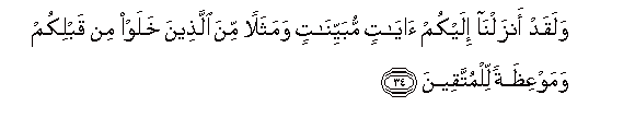 34. Walaqad anzalna ilaykum ayatin mubayyinatin wamathalan mina allatheena khalaw min qablikum wamawAAithatan lilmuttaqeena