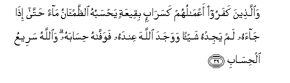 39. Waallatheena kafaroo aAAmaluhum kasarabin biqeeAAatin yahsabuhu alththam-anu maan hatta itha jaahu lam yajidhu shay-an wawajada Allaha AAindahu fawaffahu hisabahu waAllahu sareeAAu alhisabi