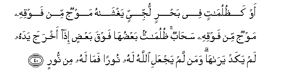 40. Aw kathulumatin fee bahrin lujjiyyin yaghshahu mawjun min fawqihi mawjun min fawqihi sahabun thulumatun baAAduha fawqa baAAdin itha akhraja yadahu lam yakad yaraha waman lam yajAAali Allahu lahu nooran fama lahu min noorin