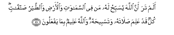 41. Alam tara anna Allaha yusabbihu lahu man fee alssamawati waal-ardi waalttayru saffatin kullun qad AAalima salatahu watasbeehahu waAllahu AAaleemun bima yafAAaloona