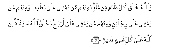45. WaAllahu khalaqa kulla dabbatin min ma-in faminhum man yamshee AAala batnihi waminhum man yamshee AAala rijlayni waminhum man yamshee AAala arbaAAin yakhluqu Allahu ma yashao inna Allaha AAala kulli shay-in qadeerun