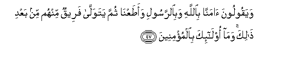 47. Wayaqooloona amanna biAllahi wabialrrasooli waataAAna thumma yatawalla fareequn minhum min baAAdi thalika wama ola-ika bialmu/mineena