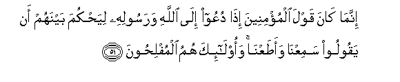 51. Innama kana qawla almu/mineena itha duAAoo ila Allahi warasoolihi liyahkuma baynahum an yaqooloo samiAAna waataAAna waola-ika humu almuflihoona