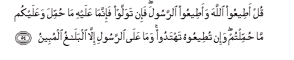 54. Qul ateeAAoo Allaha waateeAAoo alrrasoola fa-in tawallaw fa-innama AAalayhi ma hummila waAAalaykum ma hummiltum wa-in tuteeAAoohu tahtadoo wama AAala alrrasooli illa albalaghu almubeena