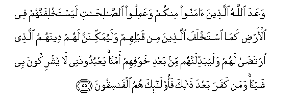 55. WaAAada Allahu allatheena amanoo minkum waAAamiloo alssalihati layastakhlifannahum fee al-ardi kama istakhlafa allatheena min qablihim walayumakkinanna lahum deenahumu allathee irtada lahum walayubaddilannahum min baAAdi khawfihim amnan yaAAbudoonanee la yushrikoona bee shay-an waman kafara baAAda thalika faola-ika humu alfasiqoona