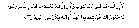 64. Ala inna lillahi ma fee alssamawati waal-ardi qad yaAAlamu ma antum AAalayhi wayawma yurjaAAoona ilayhi fayunabbi-ohum bima AAamiloo waAllahu bikulli shay-in AAaleemun