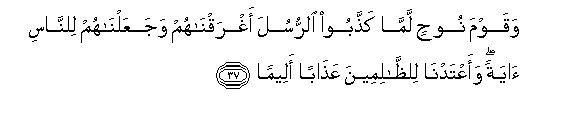 37. Waqawma noohin lamma kaththaboo alrrusula aghraqnahum wajaAAalnahum lilnnasi ayatan waaAAtadna lilththalimeena AAathaban aleeman
