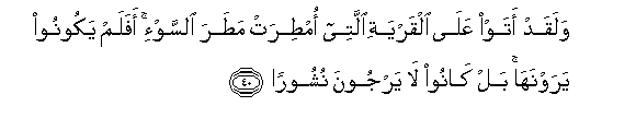 40. Walaqad ataw AAala alqaryati allatee omtirat matara alssaw-i afalam yakoonoo yarawnaha bal kanoo la yarjoona nushooran