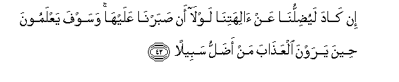 42. "He indeed would well-nigh have misled us from our gods, had it not been that we were constant to them!" - Soon will they know, when they see the Penalty, who it is that is most misled in Path!
