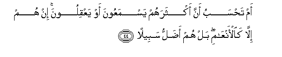 44. Am tahsabu anna aktharahum yasmaAAoona aw yaAAqiloona in hum illa kaal-anAAami bal hum adallu sabeelan