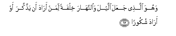62. And it is He Who made the Night and the Day to follow each other: for such as have the will to celebrate His praises or to show their gratitude.