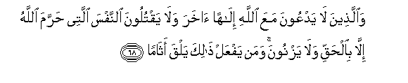 68. Waallatheena la yadAAoona maAAa Allahi ilahan akhara wala yaqtuloona alnnafsa allatee harrama Allahu illa bialhaqqi wala yaznoona waman yafAAal thalika yalqa athaman
