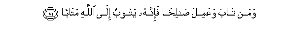 71. Waman taba waAAamila salihan fa-innahu yatoobu ila Allahi mataban