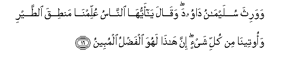 16. Wawaritha sulaymanu dawooda waqala ya ayyuha alnnasu AAullimna mantiqa alttayri waooteena min kulli shay-in inna hatha lahuwa alfadlu almubeenu
