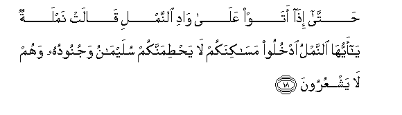 18. Hatta itha ataw AAala wadi alnnamli qalat namlatun ya ayyuha alnnamlu odkhuloo masakinakum la yahtimannakum sulaymanu wajunooduhu wahum la yashAAuroona