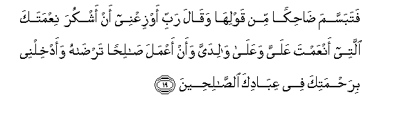 19. Fatabassama dahikan min qawliha waqala rabbi awziAAnee an ashkura niAAmataka allatee anAAamta AAalayya waAAala walidayya waan aAAmala salihan tardahu waadkhilnee birahmatika fee AAibadika alssaliheena