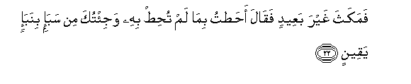 22. Famakatha ghayra baAAeedin faqala ahattu bima lam tuhit bihi waji/tuka min saba-in binaba-in yaqeenin