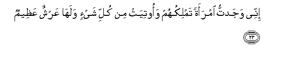 23. Innee wajadtu imraatan tamlikuhum waootiyat min kulli shay-in walaha AAarshun AAatheemun