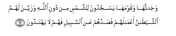 24. Wajadtuha waqawmaha yasjudoona lilshshamsi min dooni Allahi wazayyana lahumu alshshaytanu aAAmalahum fasaddahum AAani alssabeeli fahum la yahtadoona