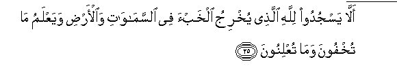 25. Alla yasjudoo lillahi allathee yukhriju alkhabaa fee alssamawati waal-ardi wayaAAlamu ma tukhfoona wama tuAAlinoona