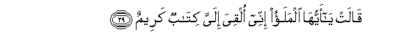 29. Qalat ya ayyuha almalao innee olqiya ilayya kitabun kareemun