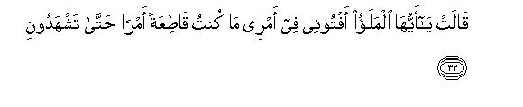 32. Qalat ya ayyuha almalao aftoonee fee amree ma kuntu qatiAAatan amran hatta tashhadoona