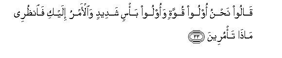 33. They said: "We are endued with strength, and given to vehement war: but the command is with thee; so consider what thou wilt command."