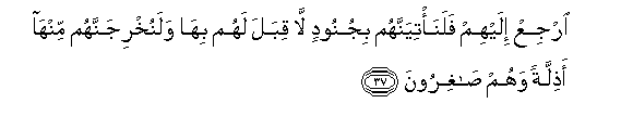 37. IrjiAA ilayhim falana/tiyannahum bijunoodin la qibala lahum biha walanukhrijannahum minha athillatan wahum saghiroona