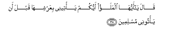 38. Qala ya ayyuha almalao ayyukum ya/teenee biAAarshiha qabla an ya/toonee muslimeena