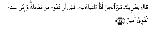 39. Qala AAifreetun mina aljinni ana ateeka bihi qabla an taqooma min maqamika wa-inne AAalayhi laqawiyyun ameenun