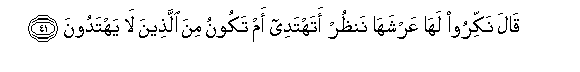 41. He said: "Transform her throne out of all recognition by her: let us see whether she is guided (to the truth) or is one of those who receive no guidance."