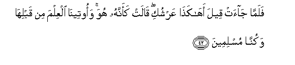 42. Falamma jaat qeela ahakatha AAarshuki qalat kaannahu huwa waooteena alAAilma min qabliha wakunna muslimeena