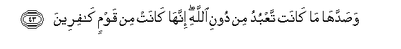 43. Wasaddaha ma kanat taAAbudu min dooni Allahi innaha kanat min qawmin kafireena
