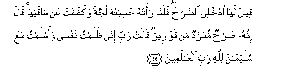 44. Qeela laha odkhulee alssarha falamma raat-hu hasibat-hu lujjatan wakashafat AAan saqayha qala innahu sarhun mumarradun min qawareera qalat rabbi innee thalamtu nafsee waaslamtu maAAa sulaymana lillahi rabbi alAAalameena