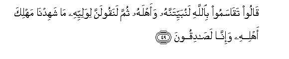 49. Qaloo taqasamoo biAllahi lanubayyitannahu waahlahu thumma lanaqoolanna liwaliyyihi ma shahidna mahlika ahlihi wa-inna lasadiqoona