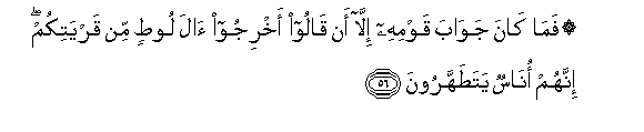 56. Fama kana jawaba qawmihi illa an qaloo akhrijoo ala lootin min qaryatikum innahum onasun yatatahharoona