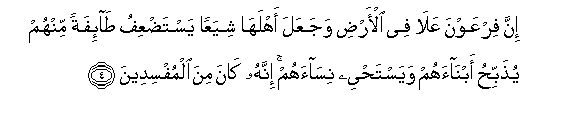 4. Inna firAAawna AAala fee al-ardi wajaAAala ahlaha shiyaAAan yastadAAifu ta-ifatan minhum yuthabbihu abnaahum wayastahyee nisaahum innahu kana mina almufsideena