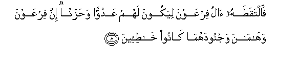8. Failtaqatahu alu firAAawna liyakoona lahum AAaduwwan wahazanan inna firAAawna wahamana wajunoodahuma kanoo khati-eena
