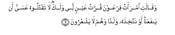 9. Waqalati imraatu firAAawna qurratu AAaynin lee walaka la taqtuloohu AAasa an yanfaAAana aw nattakhithahu waladan wahum la yashAAuroona
