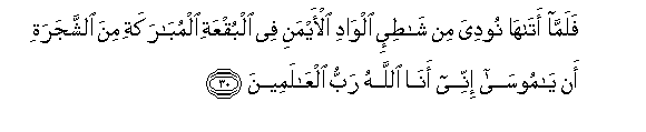 30. But when he came to the (fire), a voice was heard from the right bank of the valley, from a tree in hallowed ground: "O Moses! Verily I am Allah, the Lord of the Worlds....