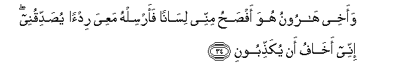34. Waakhee haroonu huwa afsahu minnee lisanan faarsilhu maAAiya rid-an yusaddiqunee innee akhafu an yukaththibooni