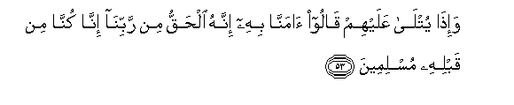 53. And when it is recited to them, they say: "We believe therein, for it is the Truth from our Lord: indeed we have been Muslims (bowing to Allah.s Will) from before this.