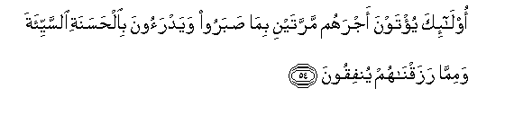 54. Ola-ika yu/tawna ajrahum marratayni bima sabaroo wayadraoona bialhasanati alssayyi-ata wamimma razaqnahum yunfiqoona