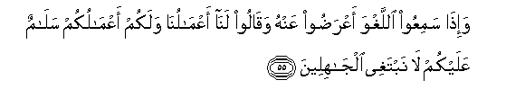 55. Wa-itha samiAAoo allaghwa aAAradoo AAanhu waqaloo lana aAAmaluna walakum aAAmalukum salamun AAalaykum la nabtaghee aljahileena