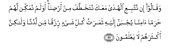 57. Waqaloo in nattabiAAi alhuda maAAaka nutakhattaf min ardina awa lam numakkin lahum haraman aminan yujba ilayhi thamaratu kulli shay-in rizqan min ladunna walakinna aktharahum la yaAAlamoona